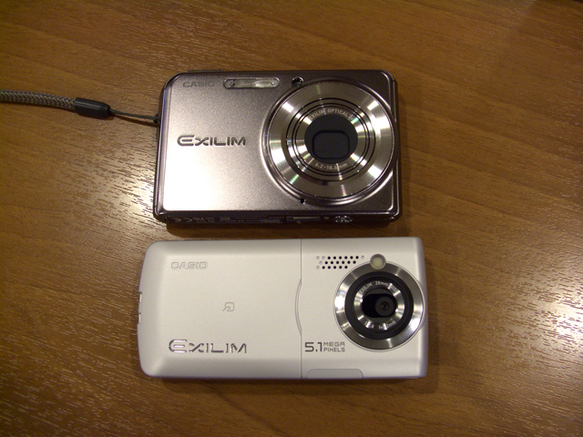 ![]() 巷で噂のEXILIMケータイ W53CAを発売日に秋葉原までいって買ってきました。 元々カシオ狂のやきょう氏曰く、「auじゃなかったら転んでた」と言わしめる機体ということで、 ついに来たるべきときが来たといわんばかりに、約三年ぶりの機種変更に踏み切った次第であります。 以前使っていたものもカシオ計算機製の、2メガのカメラがついた機種だったのですが、 その使い心地と、デジカメに携帯電話がついてるんじゃないか?と思わせるほどのカメラ性能にほれ込みまして、 これをあらゆる意味で越える機体が出るまで変更は無いだろう、と思ってました。 そろそろ何回落下させてしまったかも覚えてないし、もう全体的に傷だらけでボロボロになってきてたのですが、 ワンセグつきの携帯電話とかには全く食指が動かなかったので、いやー、ひたすら我慢の子だった甲斐があったというものです。 ついに出てしまいましたね。正真正銘の通話機能つきデジカメですよ。 スペック表でも東芝の324万画素が最高で、他社もほぼ横ばいだった中、500万画素の大台にのせてきたのもさることながら、 EXILIMの名に恥じぬスペックと高性能なエンジン、何より外観や細部へのこだわりようのキチガイさが最高にイカしてます。 . ![]() (撮影:やきょう氏) で、今日はやきょう氏の持つ本物と昨日買ったW53CAと比べてきました。(比べたいといわれたので) 見ての通り、本体カラーは白(iris white)ですね。 今までの携帯が白ばっかりだったのもありますが、赤色の機種の画面側が黒で統一感が無かったのも要因のひとつ。 全部まっかっかだったら間違いなくフレアレッドを購入していたと思う。 大きさ的にもデジカメよりちょっと縦長なだけであんまりかわりません。重さも意外すぎるほどに軽量です。 ワンセグケータイのように画面がくるっと回転してデジカメの画面と同じ働きをします。 そのとき、自動でEXILIMエンジンが起動してロゴが出るのですが、これがまたカッコイイ。なまらカッコイイ。 クレイドルは横置き、マイクロSDの挿入口もレンズの下にくる位置、シャッター半押し可能、9点AF標準装備などなど、 はっきり言って普通のデジカメです、これ。最早携帯電話かどうかが疑わしい。 ![]() (撮影:やきょう氏) 極めつけはコレ。カメラ側の電池カバーに燦然と輝く銀の刻印。卑怯すぎます。やばいです。 他にも、イヤホン端子のカバーとか、マイクの位置とか、ストラップの位置とか、 これはもう作り手のこだわり方がびっしびっし伝わってきます。すばらしい。 前評判と期待以上のモノだと思います。実に満足度は高いですね! 以下、ちょっと弄ってみてのアレコレ。 ・当初の懸念どおり、ひらべったいボタンがちょっと押しにくい。慣れの問題か。 ・画面をEXILIMモードにすると、毎回エンジン起動ロゴが出てしまう(設定で変更可能? ・カメラのレンズ部分に重心があるので、どうしても持つときにレンズ部分を触ってしまいがち ・シャッターを押すときに、ヒンジ(?)の遊びのせいでがくがく動くのが壊しそうで怖い(何 ・カメラの設定を変更するときは、EXILIMモードだと変更しづらい(手がでかいと側面ボタンがちょっと押しづらい ・サブスクリーンが無いので、閉じた状態での時間確認やメール着信確認が出来ない(結構切実 ・シャッターラグは流石に本家より劣る(やきょう氏談、でもケータイカメラとしては極限の早さ ・EXILIMエンジンを起動→終了しまくると電池が二日持たない(当たり前 以下、余談 昨日は結局、なんだかんだと家を出る前にわたわたして、結局家を出たのは11時過ぎ。 まず家を出てちょっと行ったところで、「保険証が無い」ということに気づき引き返す。 普通免許もないしパスポートどこいったかわからない(何)しで、本人確認のために住民票と健康保険証が必要だったので。 で再出発して炎天下の中駅まで歩いてハタと、「印鑑忘れた」ということに気づきまた引き返す。 クソ暑い中、駅と家を往復して汗だく&20分のロス確定。 区役所で住民票を受け取り、さあいくぞと電車に乗り込み秋葉原へ。 到着後、郵便局でお金を下ろし、ヨドバシのauカウンターで即機種変更の手続き。ちゃくちゃくと手続きを進めていると、 店「~~~~ではこの条件でよろしいですね?」 俺「はい、大丈夫です」 店「では、(印鑑のところを指差し)ここにサインを」 えっ、サインでよかったの?←心境 ていうか印鑑持ってないこと前提なのかよ! 俺の往復は無意味だったのか……とうなだれつつ、せっかくなので印鑑をポン。 話によると、受け取りは13時45分とのこと。一時間くらいの暇。 まあ丁度いいやと、炎天下の秋葉原電気街を色々と散策。主にマイクロSDの価格調査。 盆入りの土曜日ということで意外と人が多かったような。 ケバブも食べて時間もいい感じになったので、ヨドバシへ取って返す。 W53CAを受け取って、暑さも忘れてヒャッホウと2GのマイクロSDを買ったり、保護シート買ったりしてホクホク。 やきょう氏
